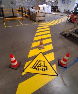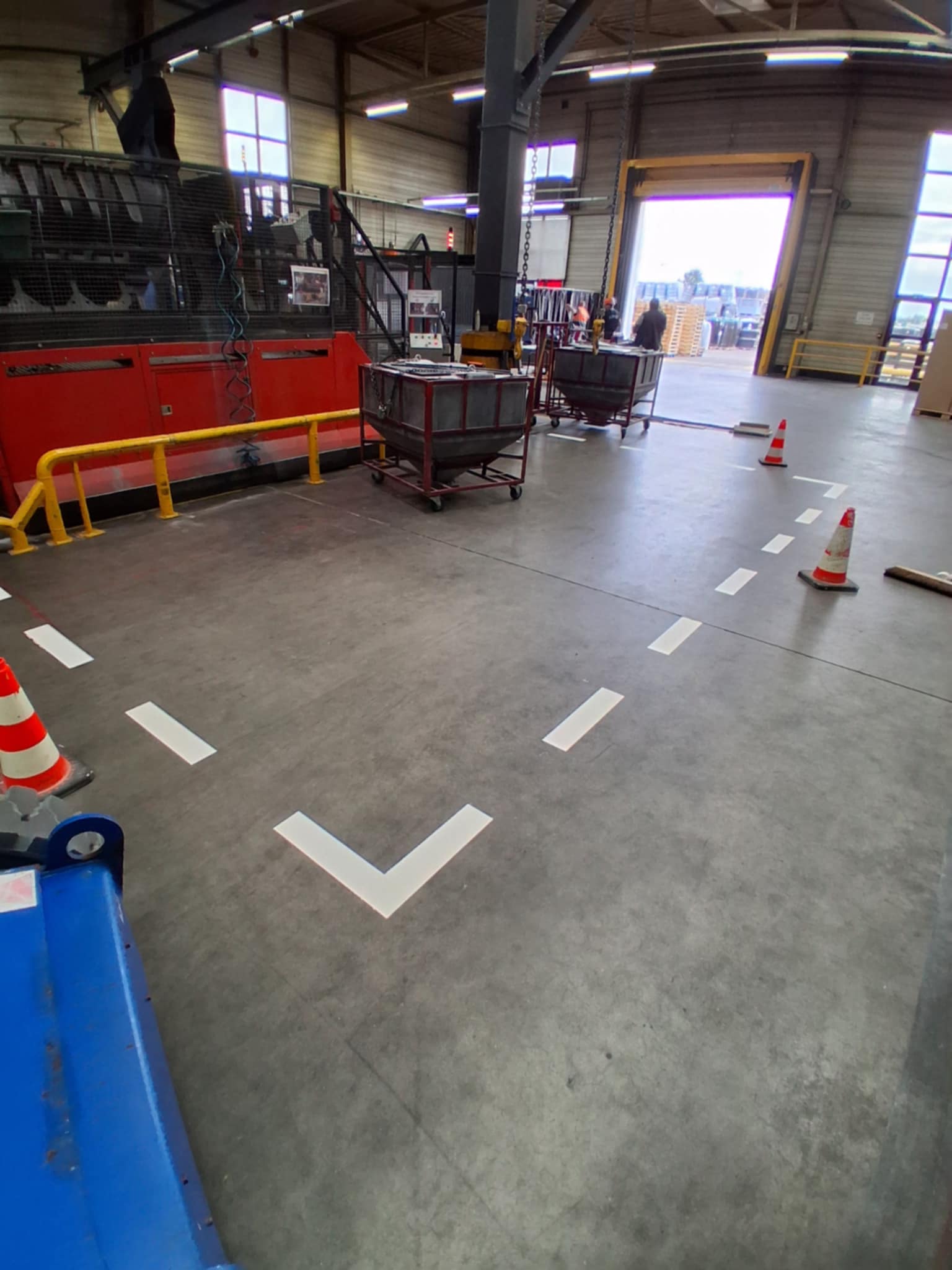 Mise en place de signalétiques au sein des entrepôts, usines et bâtiments professionnels : délimitations de zones, cheminements piétons, zones de sécurité, stationnements, etc.